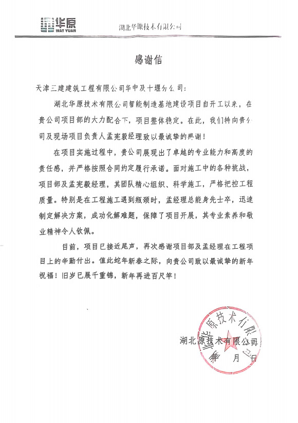 感 謝 信 天津三建建筑工程有限公司華中及十堰分么司: 湖北華原技術有限公司智能制造基地建設項目自開工以來,在責公司項目部的大力配合下,項目整體穩(wěn)定。在此,我們特向貴公司及現(xiàn)場項目負責人孟憲毅經(jīng)理致以最誠摯的感謝! 在項目實施過程中,貴公司展現(xiàn)出了卓越的專業(yè)能力和高度的責任感,并嚴格按照合同約定履行承諾。面對施工中...