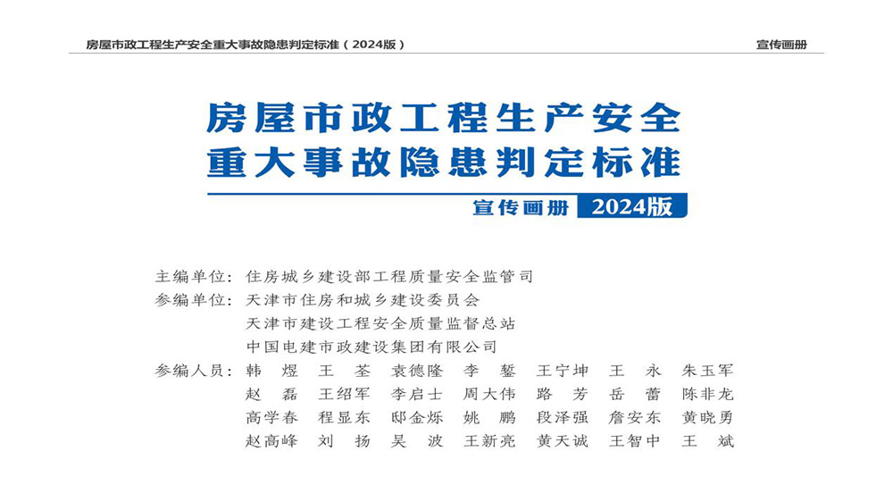 近日住房城鄉(xiāng)建設部發(fā)布《房屋市政工程生產(chǎn)安全重大事故隱患判定標準(2024版)》,我委會同市安全質(zhì)量監(jiān)督總站組織中國電建市政建設集團有限公司編制的配套宣傳畫冊和海報也由官方同步發(fā)布。
